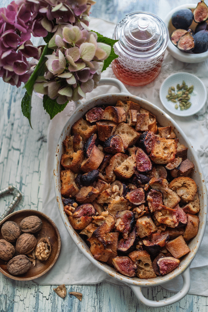 Place the bread cubes in a large bowl with the walnuts and fig pieces, then pour the milk mixture over them. Stir and allow the bread to soak for at least 15 minutes. Once the bread is saturated, spoon the mixture into the prepared pan.