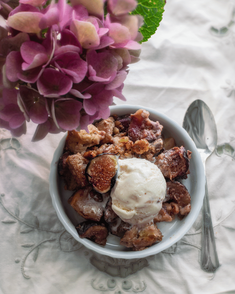 I sometimes find myself with a large part of a loaf of stale sourdough bread. I want to try something, and then my weekly cooking plans get waylaid, so I need to change direction. This happened to me recently, around the same time I had too many figs. Of course, the first thing I thought of to make with stale bread was bread pudding. Making it with figs was a whole new thing for me, so here we are.