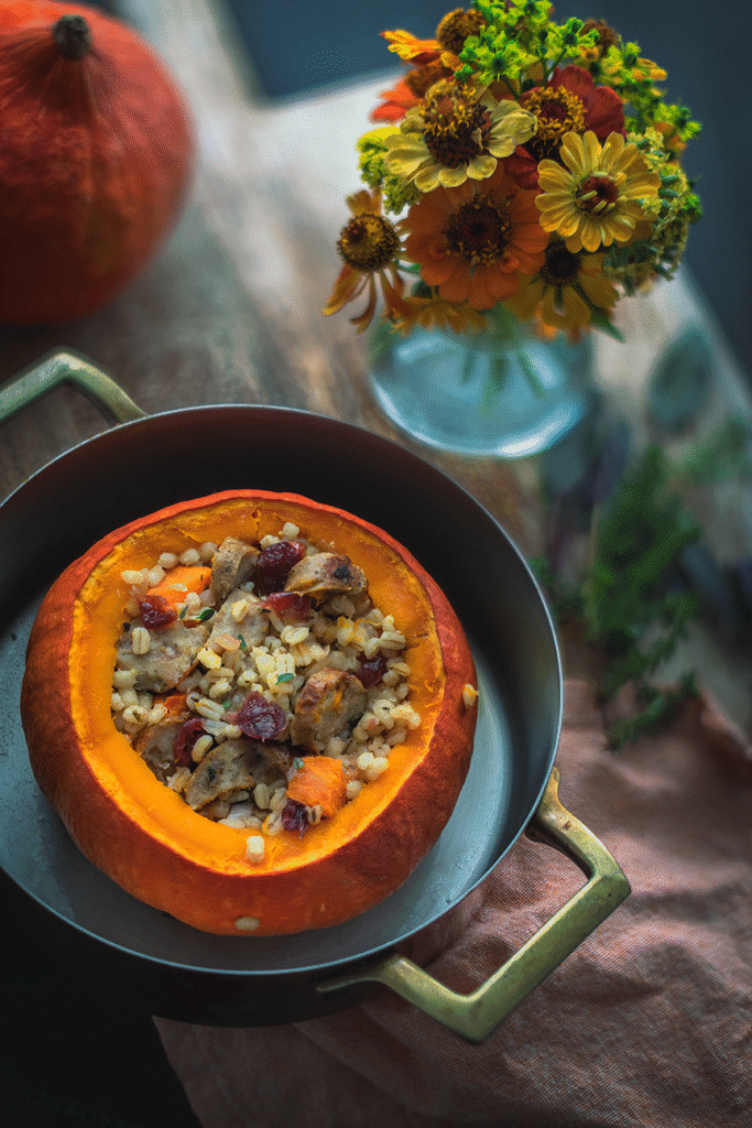 Taste and adjust seasoning if needed. I used salted chicken broth, so I didn’t need any salt. It really depends on what you use. Once satisfied with the seasoning, spoon the barley into the pumpkin shell, top it, and transfer it to a lightly oiled pan coated with cooking spray.