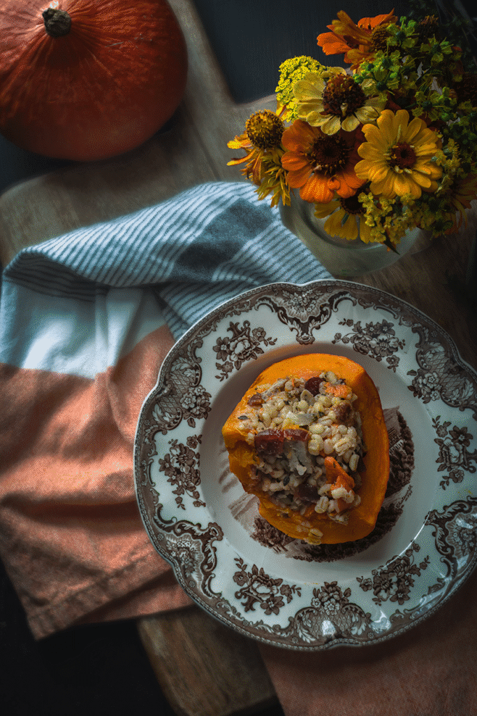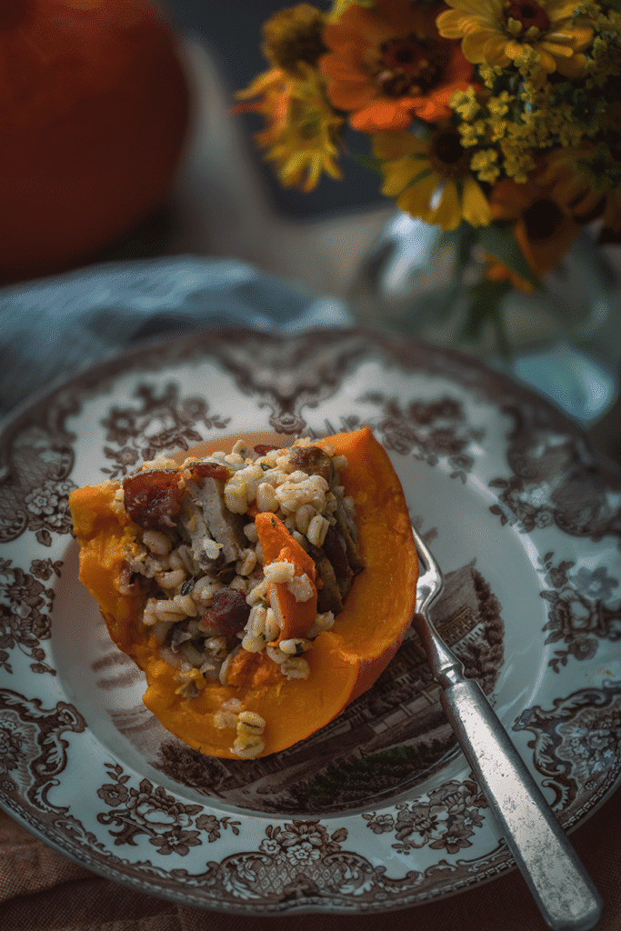 The hardest part is figuring out how much filling to make. Pumpkins do vary in size, so my medium-sized pumpkin is likely to be different than yours. I got close by getting the seeds out, then measuring how much water it took to fill it. That said, I still had filling left over, but it in itself makes a delicious side dish for a meal later in the week. This lasts for about 3 days, and the flavors blend and improve with that little bit of time, too.