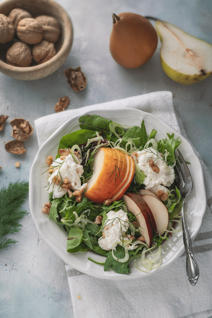 Crack open the burrata, break it into several pieces, and arrange it around the pears. Lastly, sprinkle the walnuts over the salad, and garnish with fennel fronds.